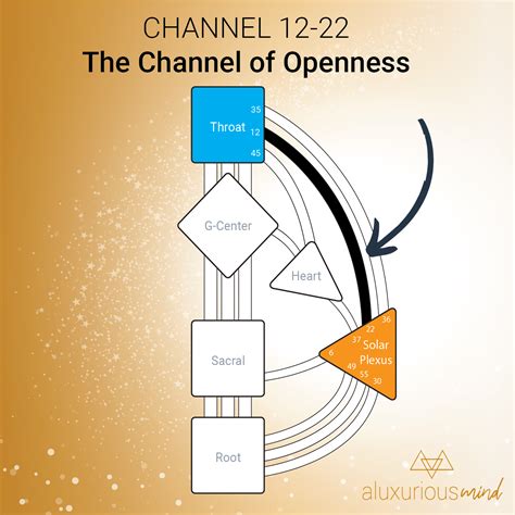 The channel of openness links the solar plexus center to the throat center through the gate of openness (22) and the gate of caution (12). When they are defined, they are colored, and when they are open, they are white. And whether the words are just fine prose or poetry, whether the words are riding on a musical frequency; A.